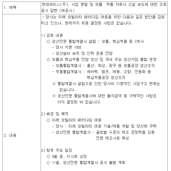 이를 위해 내달 임시 이사회를 열어 설립 안건을 승인하고, 오는 11월 새 자회사를 공식 출범시키기로 했다. 이에 따라 현대모비스의 생산 전문 자회사는 총 5곳이 될 전망이다.