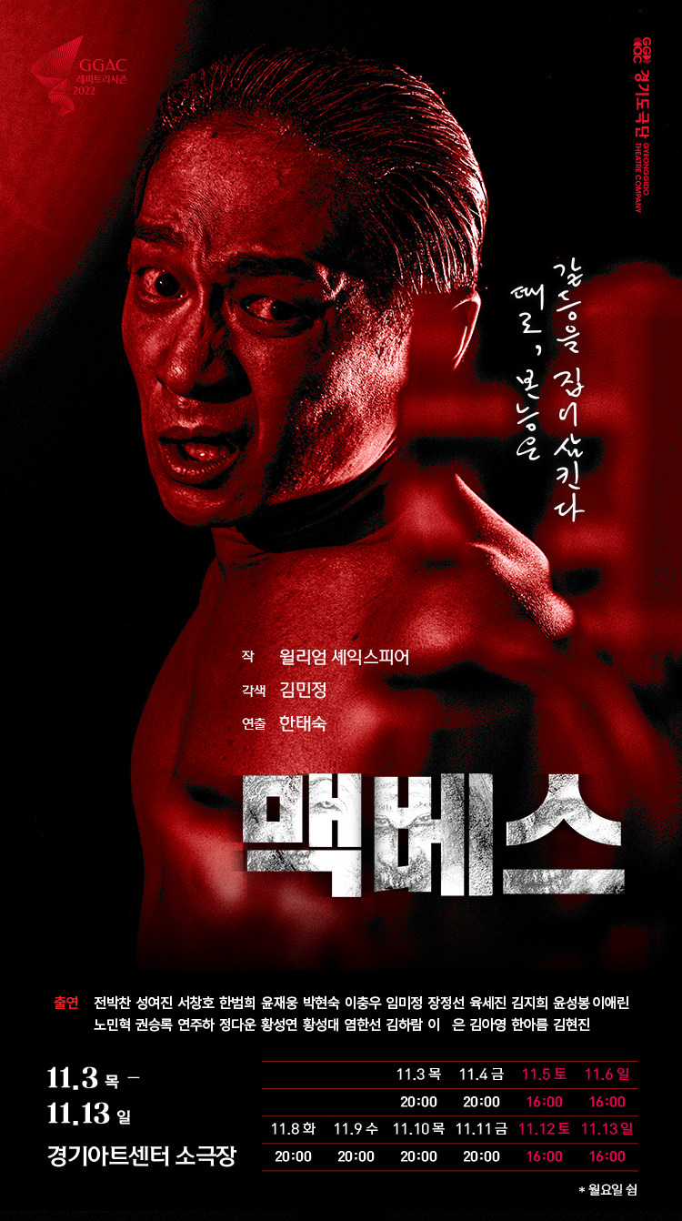 맥베스 부인의 관점을 중심으로 재해석해 연극계 찬사를 받았던 한태숙 감독의 대표작 레이디 맥베스를 뒤로하고, 2022년 경기도극단 레퍼토리 시즌 마지막 작품으로 한태숙 예술감독이 연출을 맡아, 욕망과 탐욕 앞에 굴복하고 파멸해가는 맥베스를 무대로 불러온다.