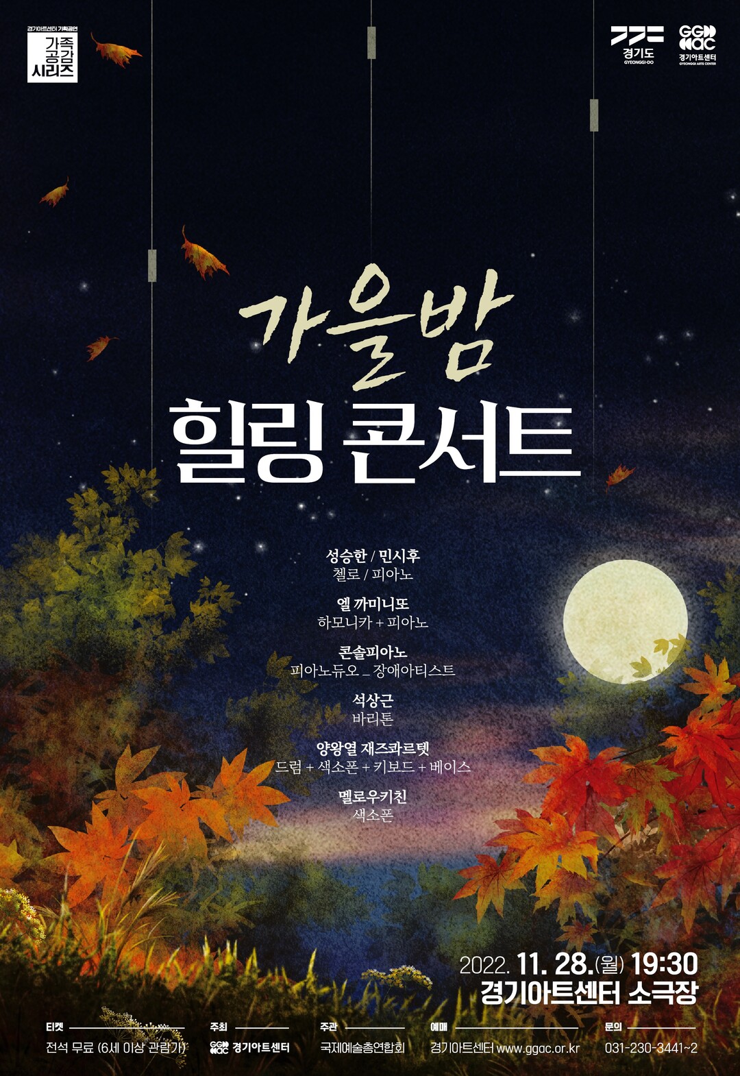 가을밤 힐링 콘서트는 전석 무료로, 경기아트센터 홈페이지에서 매수 제한 없이 신청 가능하다.