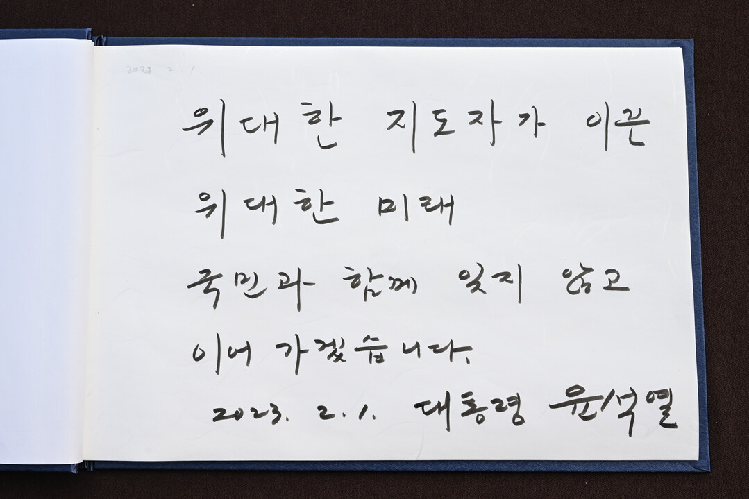 또한 방명록에 ‘위대한 지도자가 이끈 위대한 미래, 국민과 함께 잊지 않고 이어가겠습니다’라는 글도 남겼다.
